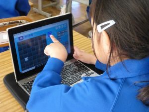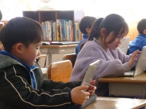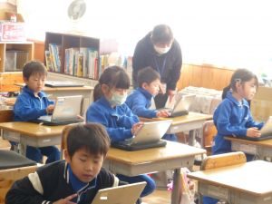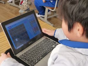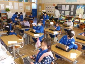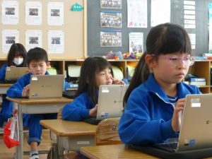 今日の1年生は、外部講師の指導の下、タブレット端末を用いた授業を行っています。こうした授業には子どもたちも興味津々で、真剣な表情で取り組む様子が見られました。先生のお話を静かに、真剣に聞くことができ、成長を感じさせる一幕でありました。