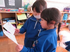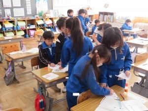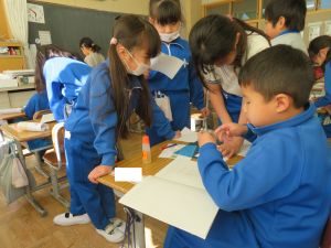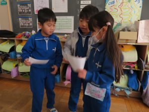 1年生の算数の様子です。お互いの考えを伝え合ったり、確かめ合ったり、ヒントを出し合ったりして、みんなで問題解決に向かっています。みんなに活躍の場があり、楽しい算数の授業が展開されていました。
