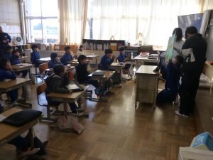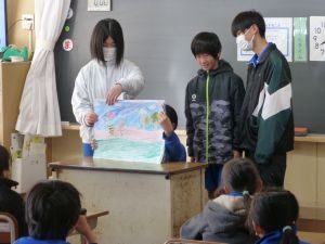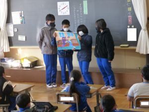 今日の朝の時間に、6年生による低学年への紙しばいがありました。物語は6年生によるオリジナルのストーリーで、今日こうして低学年のみなさんへ披露するために、絵も含めて6年生が制作、練習を行ってきたものです。1・2年生は、お兄さんお姉さんの紙しばいに笑顔で聞き入っていました。