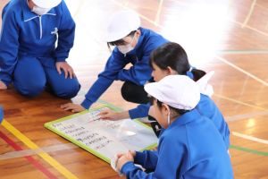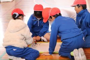 4年生は、体育の授業で「プレルボール」に取り組んでいます。「プレルボール」とは、バレーボールを簡易化したボール運動です。今日の目標は「作戦をたててゲームで実践しよう」でした。どのチームも、ボールを返す場所やポジションを工夫しながら作戦を立てていました。