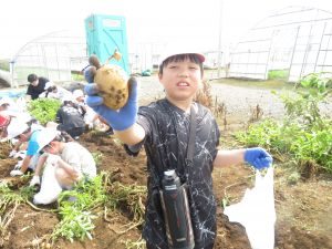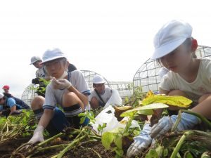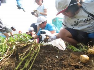 暑い中、水分補給をしながら、児童はじゃがいもの収穫を行いました。本日もお忙しい中、PTA役員の保護者の皆様にご協力をいただきました。ありがとうございました。