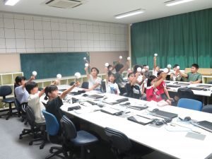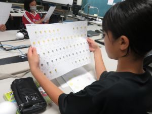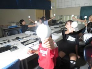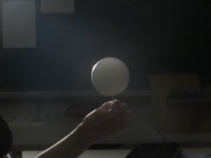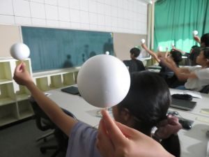 部屋を暗くして、児童一人一人が実際に月の模型を動かして、太陽の光(光源)があたる位置によって、見える月の形が変わることを観察しました。