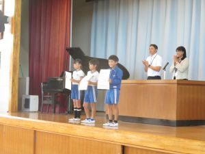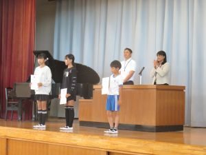 「みんなにすすめたい一冊の本推進事業」や、「科学研究作品展並びに発明工夫展」で優秀な成績を収めた児童が表彰されました。