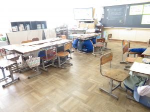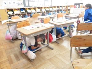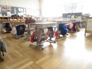 児童は、日頃の訓練を思い出し、防災無線にあわせて机の下に避難しました。