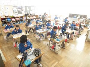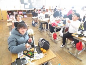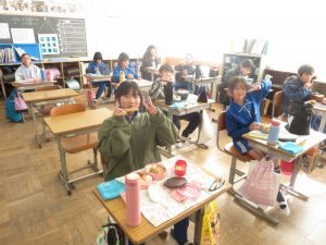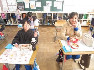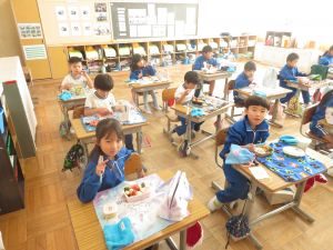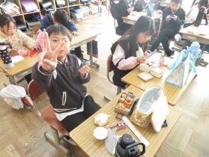 インフルエンザの予防で、前向き給食でしたが、児童は喜んでお弁当を楽しんでいました。