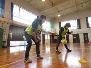 周りの人とコミュニケーションをとりながら体を動かすウォーミングアップから、ボールにふれ合いながら楽しむ運動、ユニークなサッカー等を体験しました。体験して、すごい面白かったです(*^▽^*)