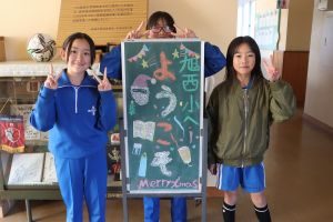 12月12日(金) 旭西小学校ウェルカムボード完成🎄休み時間になると五年生の女の子3人が職員玄関前で何やら作業を・・。 「ついに完成しました!!」とのことで行ってみると・・! 旭西小学校のウェルカムボードを描いてくれていました!サンタクロースもいてクリスマス仕様になっています。 ウェルカムボードは、職員玄関に設置し、来校されるお客様を迎えてくれます。 自分達でデザインを考え、学校のために作ってくれた五年生ありがとう!