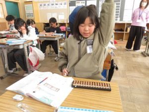 児童は、そろばんの数字の読み方をすぐに覚えて、「できた!できた!!」と計算を楽しみました。