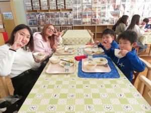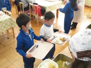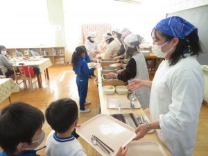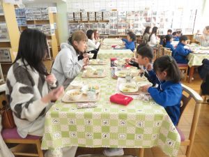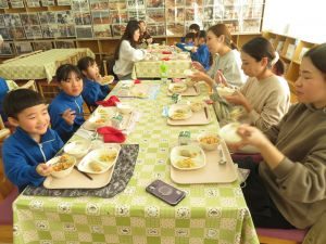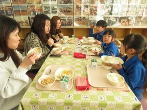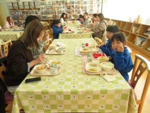 今日の家庭教育学級では、1年生児童と保護者の方とで一緒に給食を準備して会食をしました。