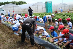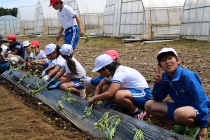 サツマイモ苗植え 6月14日講師に吉田さん PTAの小玉会長さん 高田副会長さんを招いて,サツマイモ(シルクスウィート)の苗植えをしました。 全校児童でサツマイモの苗植えをした後,4月に植えたジャガイモ(ダンシャク)の育ち具合も観察しました。 子供たちはかわいいジャガイモがなっている様子を見て,「ワーッ」っと,歓声があがりました。 吉田さん,児玉さん,高田さん,お忙しいところ子供たちのためにご協力をいただき,ありがとうございました。 |
