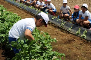 全校児童でサツマイモの苗植えをした後,4月に植えたジャガイモ(ダンシャク)の育ち具合も観察しました。