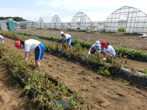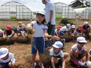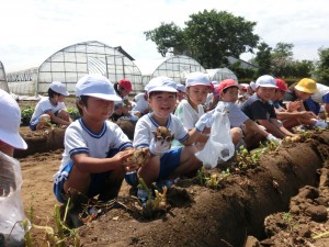 青空の下,4月に植えたジャガイモを全校児童で収穫しました。畑の中から次々と掘り起こされ,あちこちで歓声が沸き起こりました。