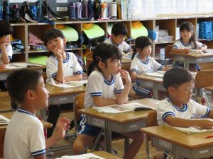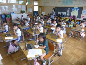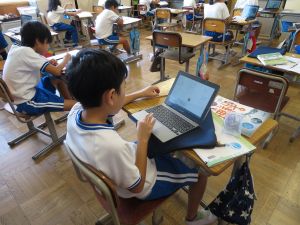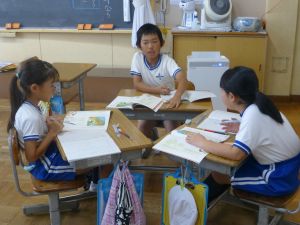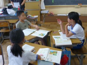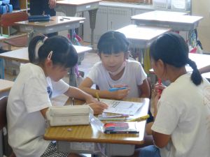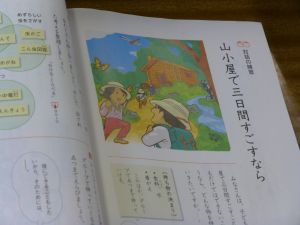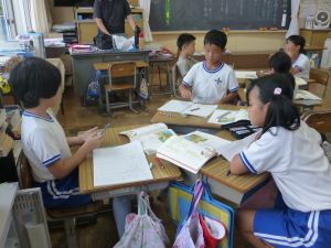 3年生の国語です。なにやらグループで話合いをしています。どうやら、話合いを行うための単元のようです。「山小屋で3日間過ごすとしたら、何を持っていきますか。持ち物を5つ決めてください。」というテーマについて、子どもたちはそのときのことをイメージしながら、それぞれが必要だと思うものを出し合い、話し合っていました。面白い単元です。