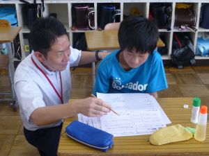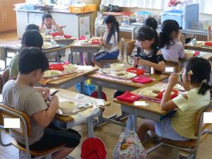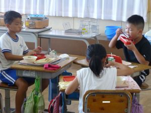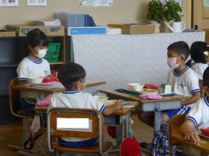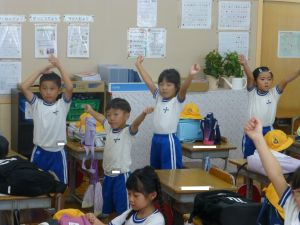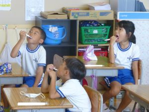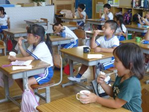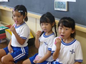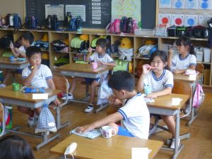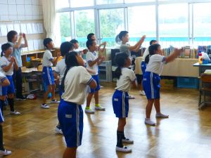 1年生の教室に行ってきました。なかなかの落ち着いており、給食の準備や片付けもスムーズで、成長を感じさせました。 養護教諭による歯みがき指導があり、さっそく給食後には丁寧な歯みがきの様子が見られました。 また、熱中症の危険性を考慮して、クーラーのきいた教室で行ったダンスの練習では、みんな笑顔で元気に踊る様子が見られ、スポーツフェスティバルが楽しみになりました。
