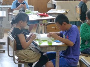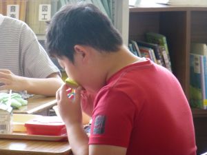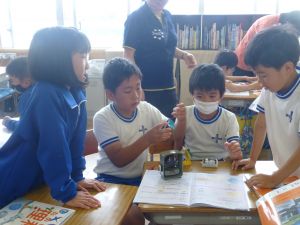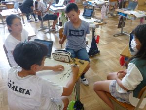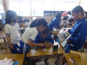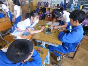 2つ目は4年生の理科です。グループで活動している様子を見に行ったら、簡易検流計で電流の大きさを測っていました。電流の大きさを測る手順は、もうばっちりですね。