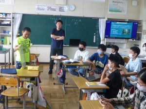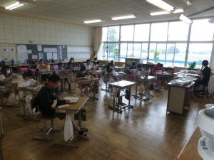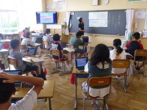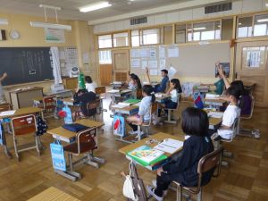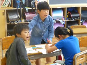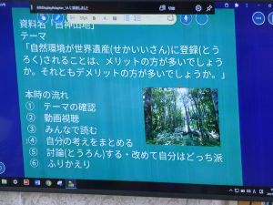 6年生は、白神山地が世界遺産化するにあたり、そこにはメリットが多いのか、あるいはデメリットが多いのかについてディベート形式で授業を進めていました。まず最初に自分の考えをもち、メリット派・デメリット派に分かれて座席を変え、最初にそれぞれの主張を述べ、そしてお互いへの疑問や質問、共感などの意見が児童の口から相次いで発表されました。担任は、議論のコーディネーター役に徹し、授業は子どもたち同士の議論が中心となって進められました。見ていてとても意味のある道徳になっているなと感じました。