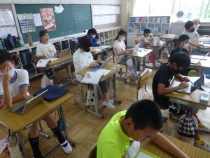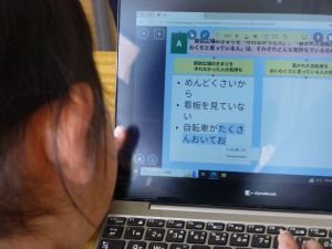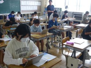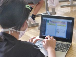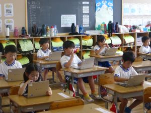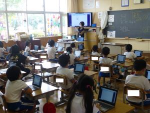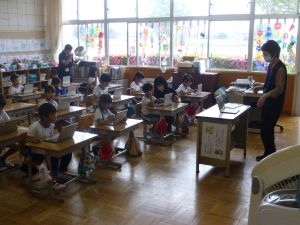 2 1年生はパソコンの勉強です。これからの学校生活の中で、タブレット端末を使う機会がどんどん増えてきますので、その操作法の基礎について外部の指導者から学んでいます。姿勢よく、お話をよく聞いている様子が印象に残りました。大変素晴らしいですね。