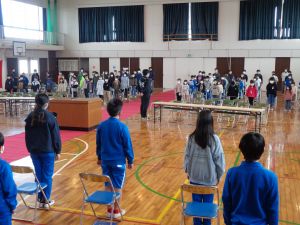 1~5年生の在校生の練習がスタートしました。今日は、卒業式の意義についてお話しした後に、座り方や礼の仕方、国家、校歌の練習、呼びかけの練習を行いました。コロナ禍以降、校歌を歌うこと、聞くことがなくなっていましたので、児童が元気に歌う校歌に感動しました。あの校歌を聞いただけで、卒業式本番がいっそう楽しみになりました。また、呼びかけの練習では、個人名を挙げればキリがないですが、はっきりとした大きな声が出ていて、素晴らしいと感じました。中でも今日は4年生の声が際立っていて、学級でしっかり練習してきたことが伺えました。4年生の心のこもった大きな言葉に大変感心しました。
