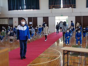 今日を終えると、6年生の残り登校日数は、卒業式を含めて9日です。いよいよ迫ってきました。 昨日始まった6年生の練習ですが、今日練習に取り組んでいる様子を見ると、全体としての雰囲気が少し本番に近づいたことを感じさせました。入場の後、国歌斉唱、卒業証書授与・・・の流れで、次第に沿って練習を進めていました。特に、卒業証書授与の練習では、返事をして、立って、向きを変えて、進んで、来賓席等に礼をして・・・といった一連の流れについて、担任の動きを見ながら全員で確認していました。1つの動作ごとに制止しながら、ゆっくりと、視線を上げて堂々と歩くその動き方は、普段の動きとは異なっているため、児童はまだ慣れない様子でしたが、練習を継続する中で徐々に慣れていくものと思います。