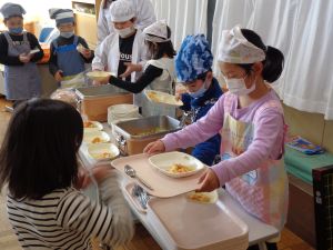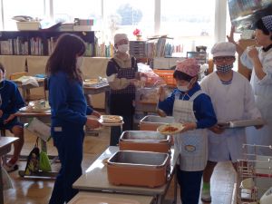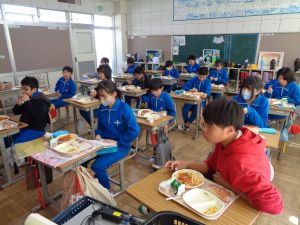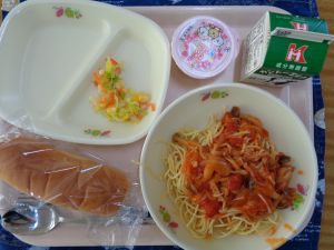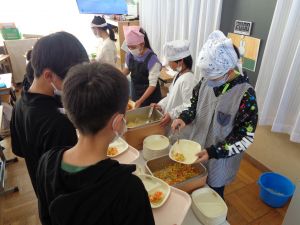 今日の給食の様子です。今日のメニューはきっとみんなが大好きであろうミートソースでした。3学期から再開した給食当番による配膳は、もうどの教室でもスムーズに進められることができています。6年生にとっては、小学校生活で最後の給食となりました。カップケーキを食べた後なので、完食するのは大変だったかもしれませんね。