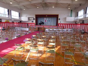 会場の準備はすっかり整いました。保護者の皆様は、お気をつけていらしてください。お待ち申し上げております。