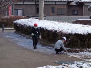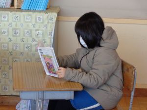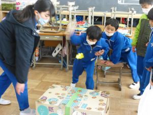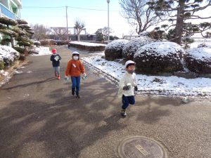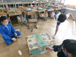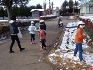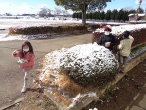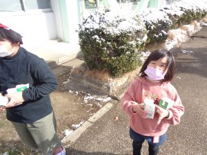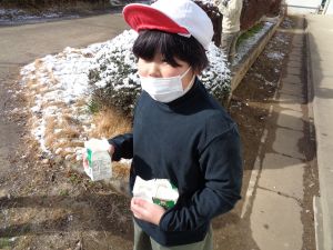 遅れて学校が始まった3時間目、校舎前のアスファルトの部分に1年生の姿がありました。牛乳パックに雪を集めているのだそうです。生活科の授業の一環かと思われます。「学校に来る前に、家で雪合戦をしてきたよ!」などと興奮気味に話している子もいました。降雪というめったにない機会なので、子どもたちはとてもはしゃいでいる様子でした。