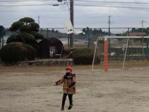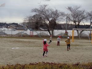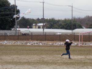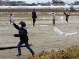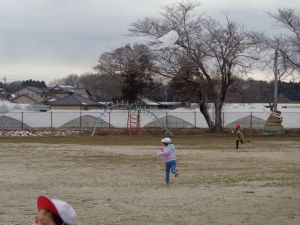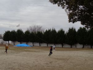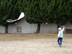 今日はついにたこあげの日。風はあまりないので、どうしても走るしかないのですが、みんな元気に走り回り、次々にたこをあげていました。本当は、晴れた青空の日だったら、もう少し「映えた」んでしょうけどね。