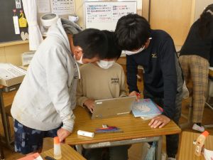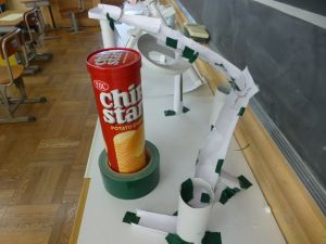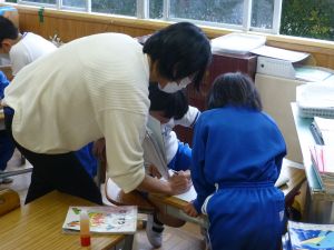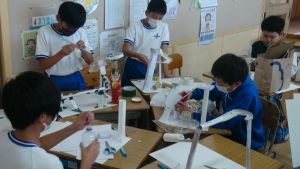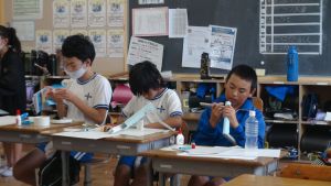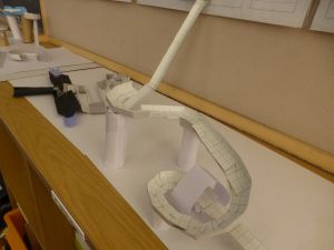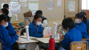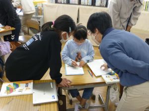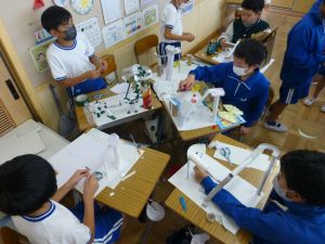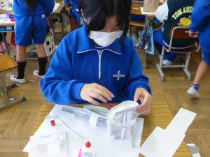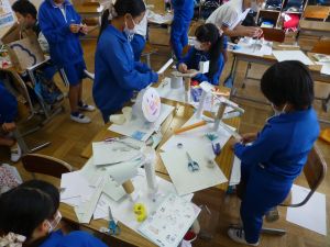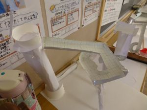 教室の後ろの棚には、図工作品が並んでいました。工作用紙等を用いて作られたそれぞれの作品は、ビー玉を転がして遊べるものになっています。これもまた「遊んでみたい!」と思わせる、なかなか面白い作品がいくつも見つかりました。