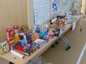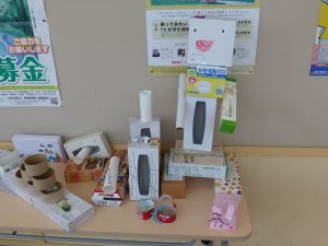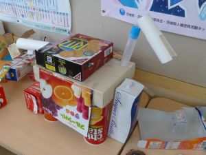 6校時、校内を歩いていたら、ロボットらしきものに遭遇しました。廊下に展示された1年生の作品です。なかなか面白い作品がたくさんありました。