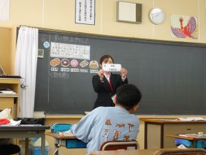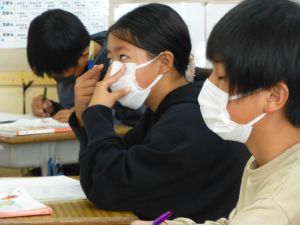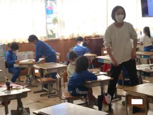 5年教室は算数の学習中。割合の勉強をしています。前回までに%(パーセント)を学習してきていましたが、今日は「割」という歩合の考え方を勉強していました。つまり、1をもとにしたときの0.6という割合は、60%であり、また同時に6割であるというものです。