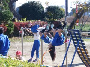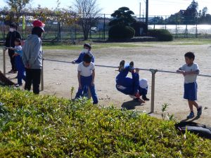 3年生は鉄棒です。連続技に挑戦しているところです。ちょうど日が照っていて、温かい中での活動でした。みんな上手にできたでしょうか。とにかくできるまで挑戦あるのみです。