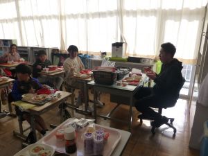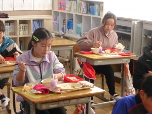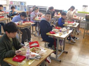 そして、6年生はお楽しみ給食です。いつもより少し豪華な給食に、みんな嬉しそうです。笑顔がいいですね。給食センターのみなさん、いつもおいしい給食をありがとうございます。