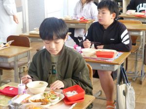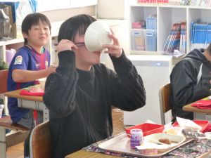 そして、6年生はお楽しみ給食です。いつもより少し豪華な給食に、みんな嬉しそうです。笑顔がいいですね。給食センターのみなさん、いつもおいしい給食をありがとうございます。 食育が叫ばれて久しいですが、私たちの丈夫な体を作り、そして私たちを笑顔にしてくれる食事の大切さを再確認しました。保護者の皆様、給食センターの皆様には、心から感謝、感謝です。