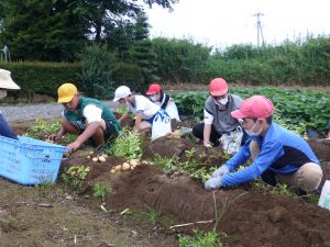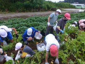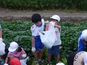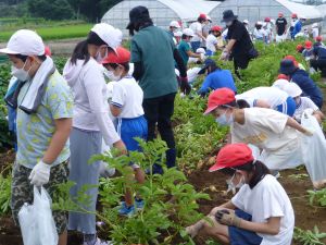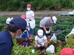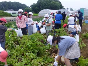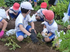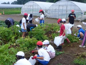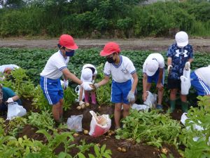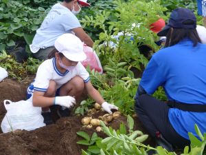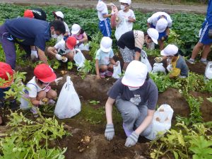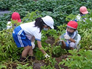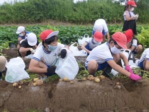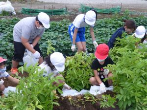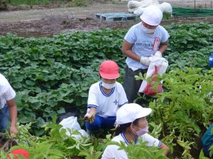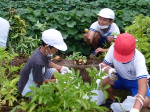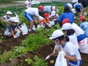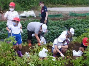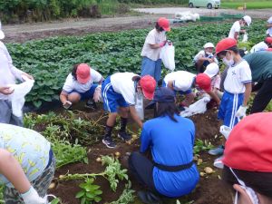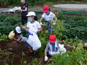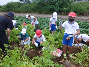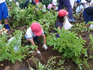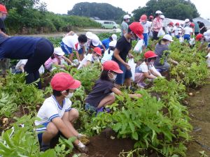 雨の合間を縫っての実施ということで調整が難しく、今日まで延びてしまいました。「やるよ」「やるよ」と声をかけながら、子どもたちをだいぶ待たせることになってしまいましたが、ようやくじゃがいもの収穫を行うことができました。 ということで、収穫したじゃがいもを本日持ち帰りますので、ご家庭でお早めにお召し上がりください。