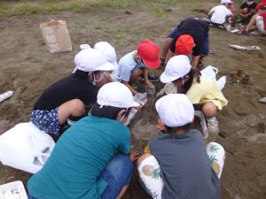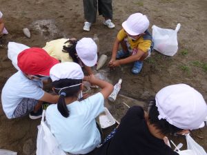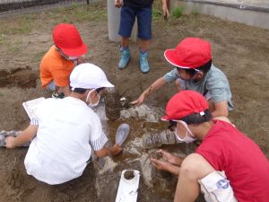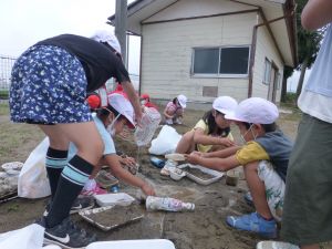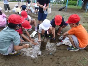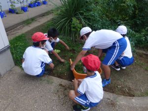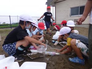じゃがいも収穫に引き続いての2校時、砂場に1年生の姿がありました。「生活科なのかな?」と聞くと、「生活と図工!」という声が児童から聞かれました。砂場での水・砂遊びの様子です。このあと雨が降り出したことを考えると、ぎりぎりセーフのタイミングだったのかもしれません。 どんなことをして楽しんだのか、1年生の保護者のみなさんは、是非ご家庭での話題にしていただければと思います。