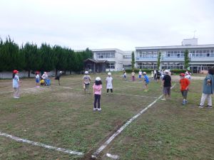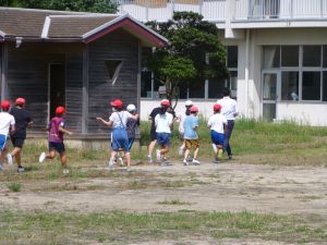 縦割り遊びの日。曇り空の下、全校児童が校庭を楽しく走り回っていました。 子どもたちならではの、私たち大人が知らない遊びを楽しむ様子も見られました。