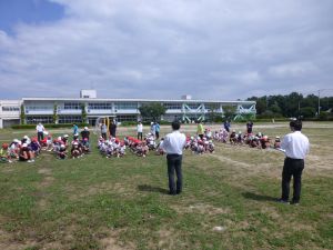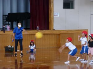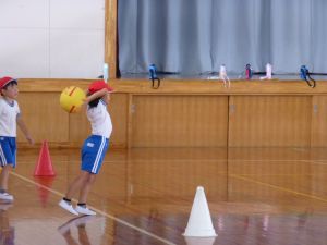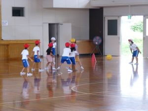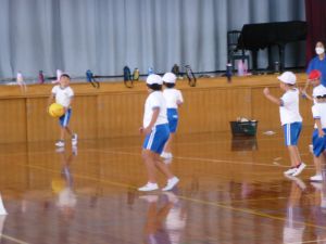 地震は、学校にいるとき以外にも、いつ起こるか分かりませんし、原発の近隣に住んでいるということは、有事の際にはそこからの避難についても覚えておかなければなりません。 校長先生から、地震では「落ちてくるもの」「倒れてくるもの」「動いてくるもの」から離れること、原子力については「コンクリートの建物に入ること」などが大切であるという話がありました。これらをヒントに、ご家庭でも、もしもの時のために、避難の仕方について話し合う機会をもっていただけるといいかなと思います。 体育館から元気な声が聞こえてきました。 行ってみると、1年生の体育。ドッチボールを楽しんでいました。 久しぶりにみんなで体育、楽しいようです。