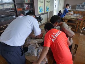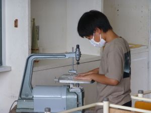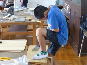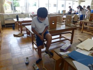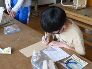 図工室には6年生の姿があります。木工の授業です。のこぎり、糸のこ、キリ、グルーガン?等、様々な道具を用いて創作活動を行っていました。精密に下書きをする様子も見られました。