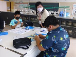 ちょうどその頃家庭科室では、5年生が家庭科の授業中でした。玉止め・玉結びが今日のめあてです。うまくできたでしょうか。