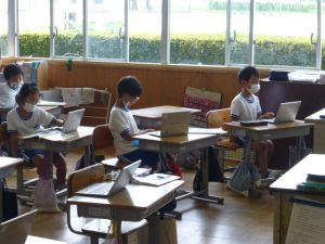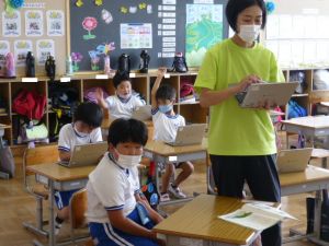 通信機器等の活用により、いじめの問題が深刻化している現状、また犯罪に巻き込まれる、場合によって加害者にもなり得るといった状況については、皆様すでにご承知の通りです。また、スマホ・オンラインゲーム等のやりすぎによって生活リズムを崩し、体調を崩したり、引きこもりになり学校や仕事に行けなくなったりといった例も数多く報告されているところです。 ただ一方で、これからの時代を生きる子どもたちにとって、ネットワークを通じた通信に全く関わらない人生は考えにくい状況になっています。つまりこうした便利なシステムは、上手に使えば使う価値がありますし、誤った使い方をすれば様々な問題が生じるわけです。そのため、私たち大人、そして子どもたちが「正しい知識」をもつこと、そして各家庭において、親子が主体的に話し合い、ルールを決め、それを守っていくことが大変重要と言われています。 今回提出いただいた話合いシートを見ましても、親子でしっかり話合いをもち、ルールを考えてくださった跡を見て取ることができ、大変感謝する次第です。まもなく夏休みという今の段階でしっかり話をすることは、よりよい夏休みに向けて大変意味のあることと考えております。 なお、このルールづくりは全家庭の皆様に協力をお願いしているものです。提出がお済みでない方は、明日以降、夏休みまでに入るまでに家庭で話合いを行っていただき、ご提出いただけますようよろしくお願いいたします。 1年生がタブレット端末を使用している場面です。