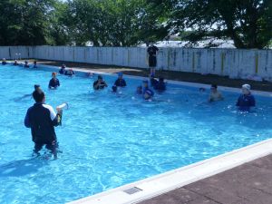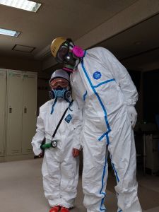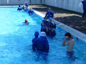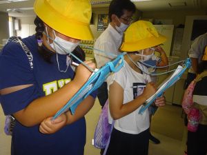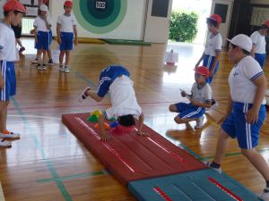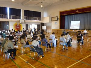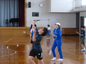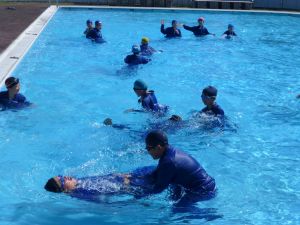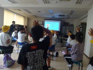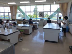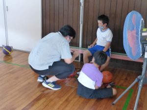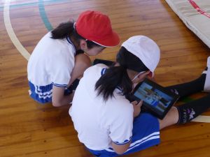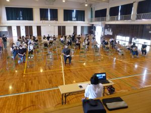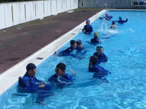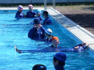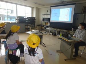 午後の高学年は着衣泳です。午前中には中・低学年も実施しました。これは先週、低温のために実施しなかった分の着衣泳の実施です。高学年では、プールでの実施前に、着衣泳のポイントについて動画を視聴して確認し、そのポイントに沿って練習等を行っていました。