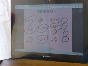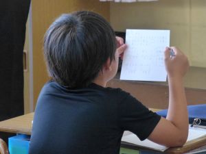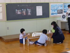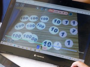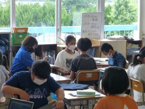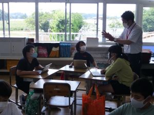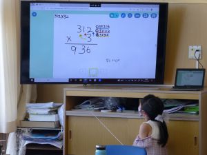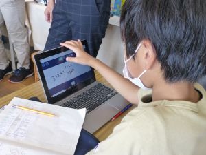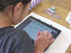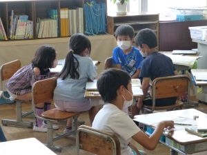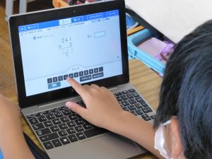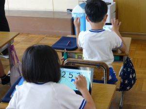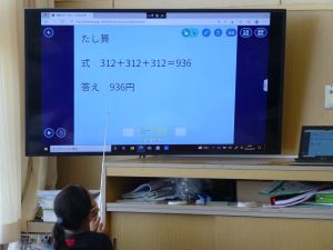 なお、今後も水泳学習が続きます。水泳学習の参加については、危険を伴う場合も考えられるため、保護者の皆様の了承が必ず必要となります。保護者の皆様には、ご自宅での検温、健康観察の上、リーバーへの入力の徹底を改めてお願いいたします。 午後、研修支援訪問があり、教育研修センターの先生の参観のもと、3年生算数の研究授業を行いました。学習内容は、3けた×1けたのかけ算の仕方についてです。 最終的には筆算での計算にもっていくのですが、どうして筆算で計算できるのか、そのもとになる考え方について、子どもたちは友達と熱心に話し合っていました。