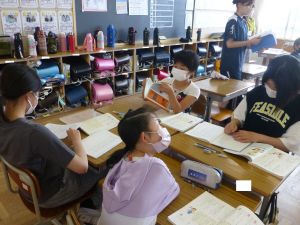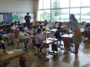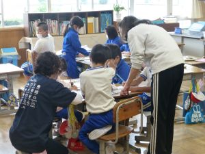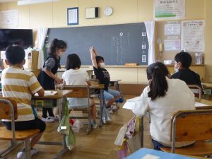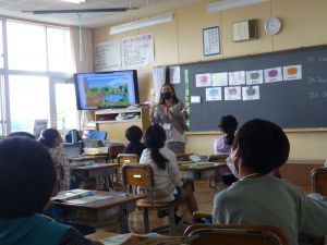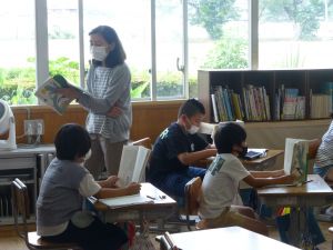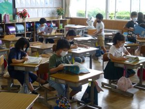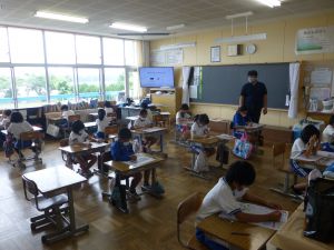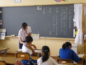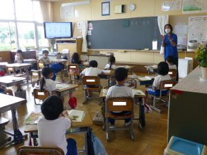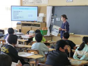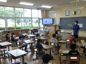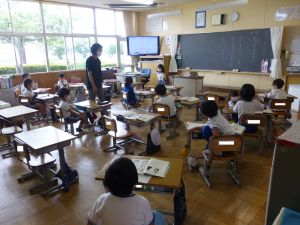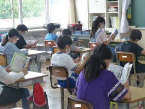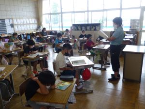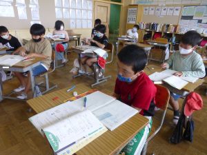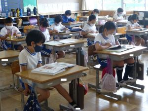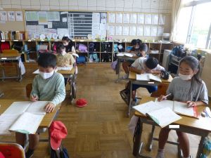 1年生は国語。「くちばし」の単元です。先生の読みに続いて、児童も読んでいます。鳥の種類によって、くちばしの色も形もちがうのですね。
