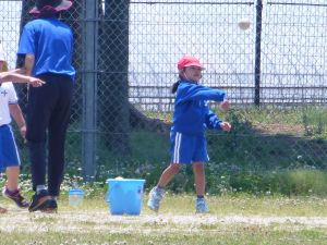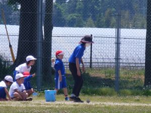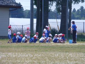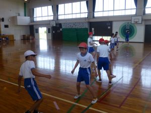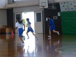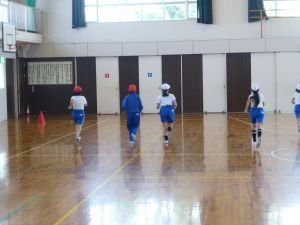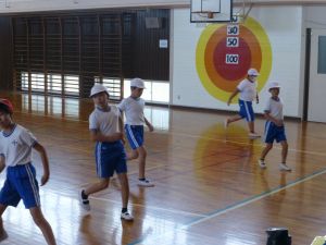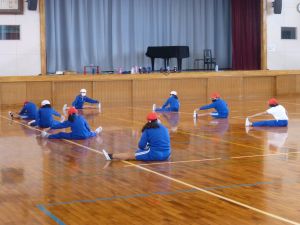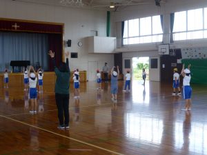 3年生は体育。準備運動をしています。今日は体力テストかな。