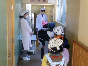 次は給食です。1年生の給食当番さんが,給食室で配膳員さんに「いただきます」のあいさつをして,給食を受け取るところです。