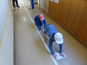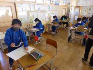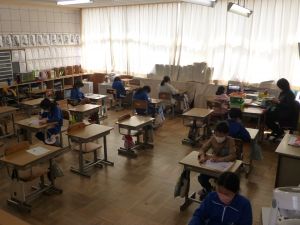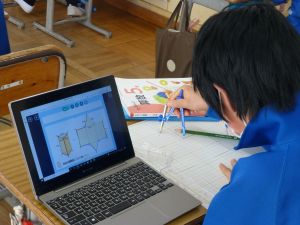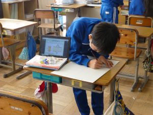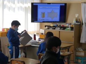 5年生は算数の授業で,立体の見取り図と展開図の学習をしています。今日は展開図について学び,実際に厚紙に展開図を描いて,三角柱を組み立てていました。