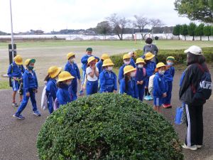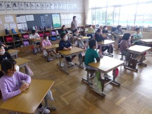 なんだかとても長い本です。木田先生が見上げるくらいの高さで,子どもたちも興味津々先生の読み聞かせに見入っていました。 1年生は,今日はこのあと鹿島灘海浜公園への校外学習です。よい天気になってよかったですね。楽しんできてください。