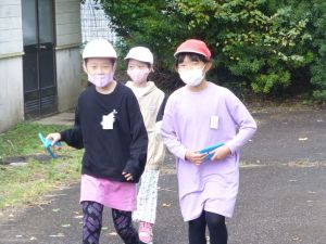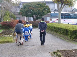 まず1年生が外に出てきました。いよいよ出発です。校長先生に朝のあいさつをして,校舎に向かって「いってきます」のあいさつをして,元気に出発していきました。