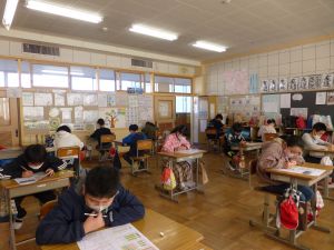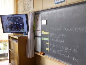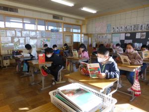今朝は,1~3年教室では読み聞かせの日となっています。 3年生は読み聞かせ動画の視聴でした。落語で有名な「まんじゅうこわい」というお話で,子どもたちはテレビ画面に見入っていました。