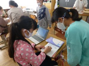2年生はどうやら道徳です。真剣な表情で,タブレットで何かを書いています。 画面を見ると,「林さん」へのメッセージが書き込まれています。「林さん」はおそらく教材の登場人物なのでしょう。なるほど道徳らしい回答がならんでいますね。